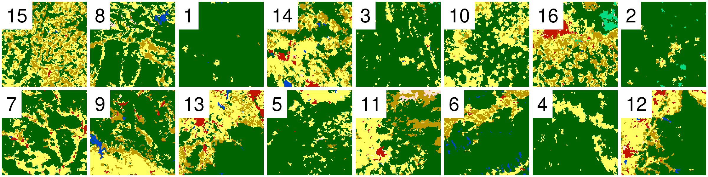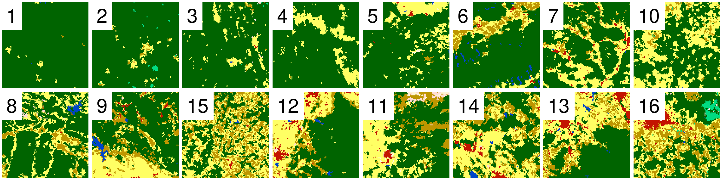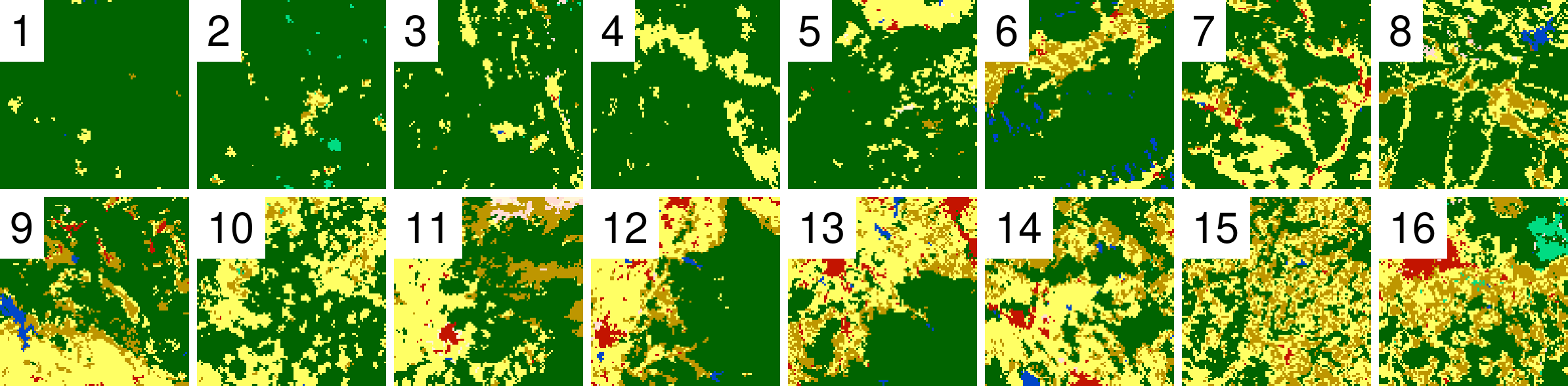 Randomly selected 16 rasters (100x100 cells) with different proportions of forest (green) areas from Land cover data for the year 2016 of the CCI-LC project (simplified into nine categories)