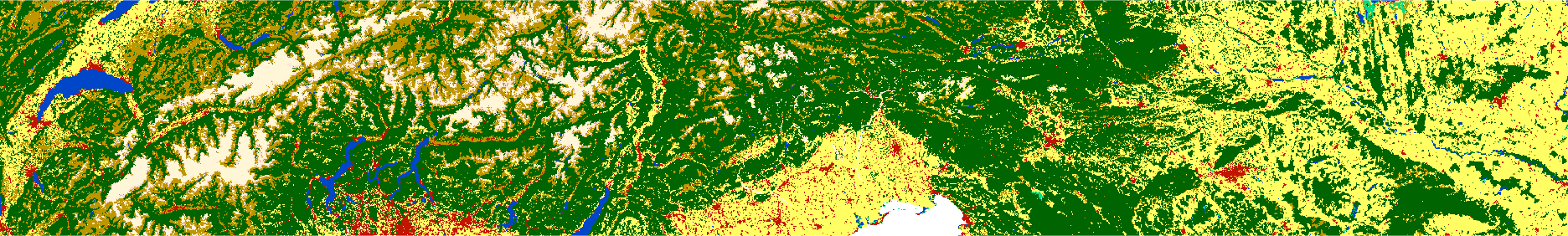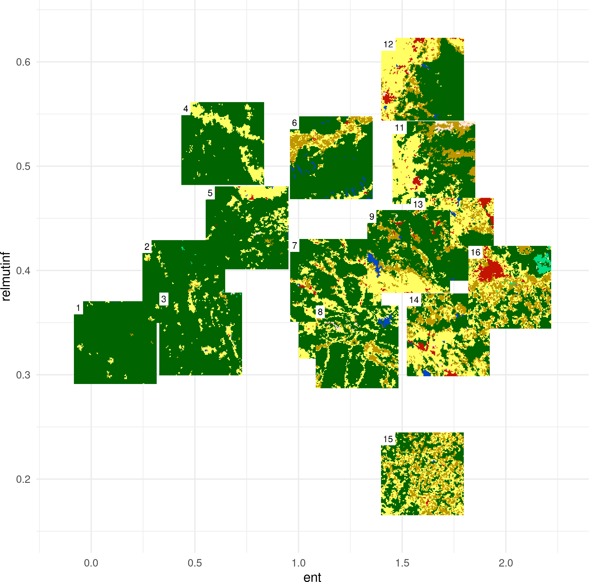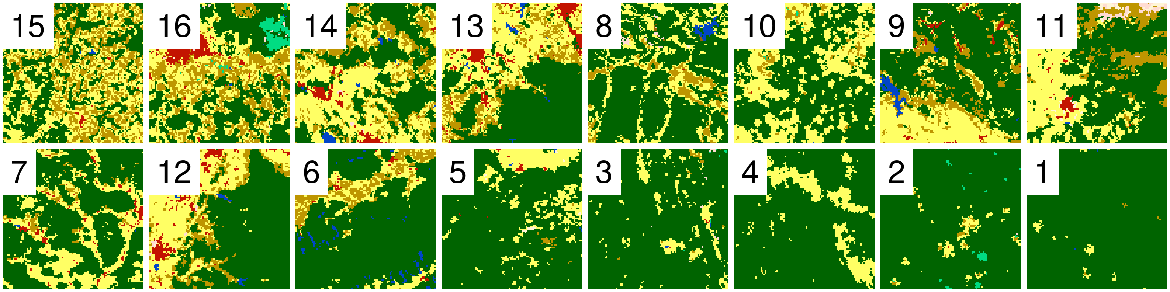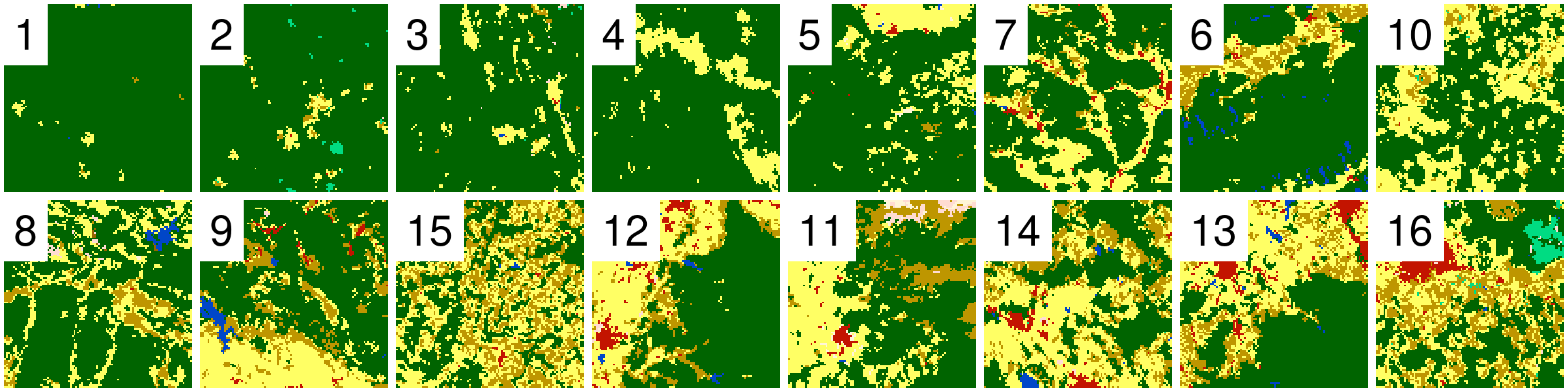 Randomly selected 16 rasters (100x100 cells) with different proportions of forest (green) areas from Land cover data for the year 2016 of the CCI-LC project (simplified into nine categories)