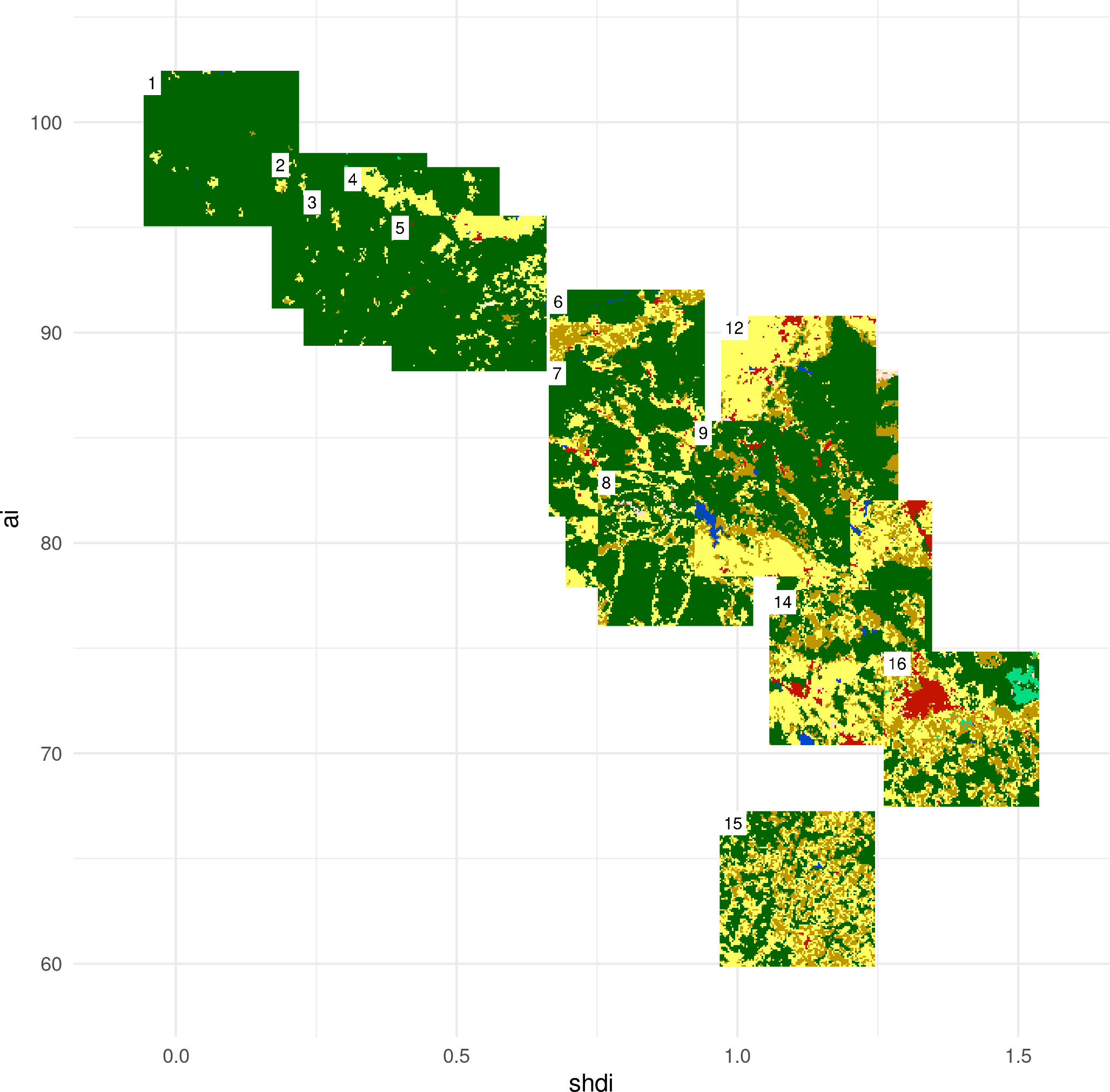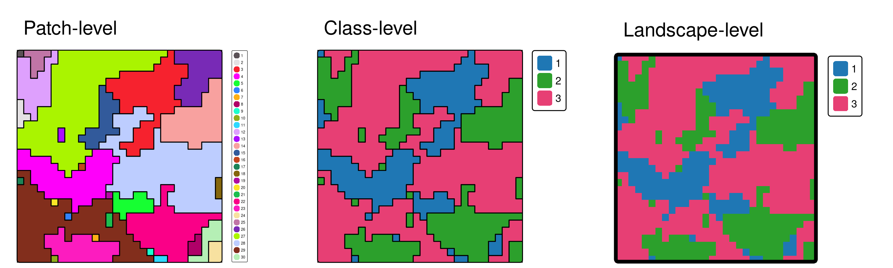 Landscape metrics can be calculated for three different levels: patch, class, and landscape (here we (mostly) focus on the landscape level)