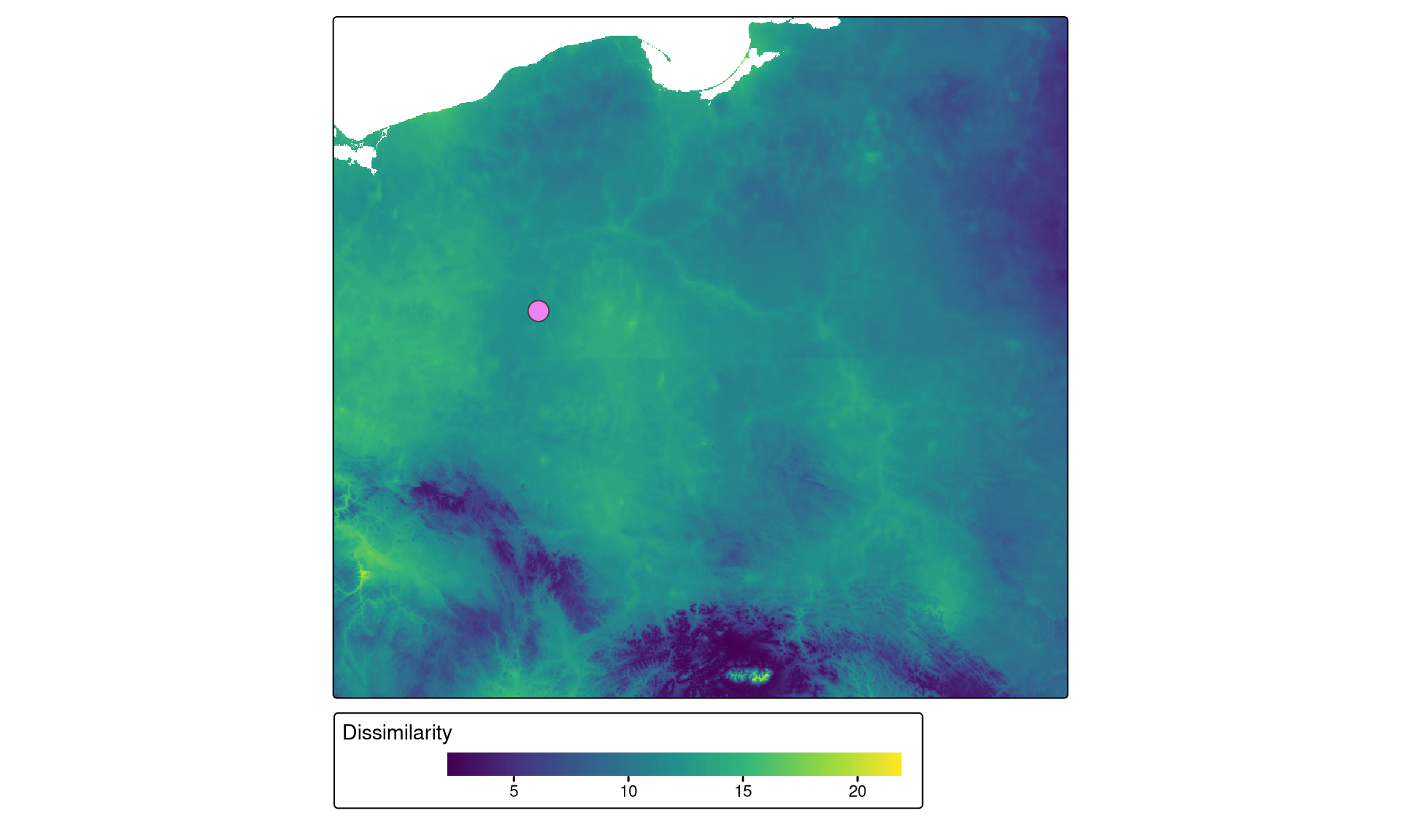 lsp_compare() function from the motif package, compare the spatial signatures of land cover in 2018 and 2023 in a window of size 25. (Hint: you need to use the "cove" signature type, "jensen-shannon" as a distance measure used, and "terra" as an output; Hint 2: see https://jakubnowosad.com/motif/articles/v4_compare.html for inspiration).dist layer of the results to highlight areas with the strongest changes. How can you interpret the results?window = 50 as it looks for areas of a similar size as AOI; Hint 2: see https://jakubnowosad.com/motif/articles/v3_search.html for inspiration). The aim is to identify areas that resemble the 2023 landscape of the AOI in the past, in order to track how such landscapes have evolved over time.WorldClim version 2.1 climate data