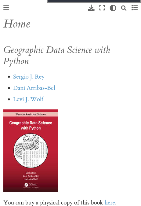 Courses/workshops:IS 616: Large Scale Data Analysis and Visualization, University of Mannheim, Germany; Geospatial Analysis in Economics with R, University of Göttingen, Germany; SOES3056 - Seascape Ecology, University of Southampton, UK; Geocomputation I, the City University of New York, USA; Advanced Research Methods, University of Barcelona, Spain; R for Earth-System Science, University of Oregon, USA; CASA0005 Geographic Information Systems and Science, University College London, England; ECS530 Analysing spatial data, Norwegian School of Economics, Norway; ESPM 288: Reproducible and Collaborative Data Science, Berkeley University of California, USA; CRD 298: Spatial Methods in Community Research, University of California, Davis, USA; CP6521 Advanced GIS, Georgia Tech, USA; Urban Data Analytics in R, University of North Carolina at Chapel Hill, USA; Geospatial Analytics, University of Leicester, UK; GEOG 28402 & 28403: Geographic Information Science II & III, University of Chicago, USA; …