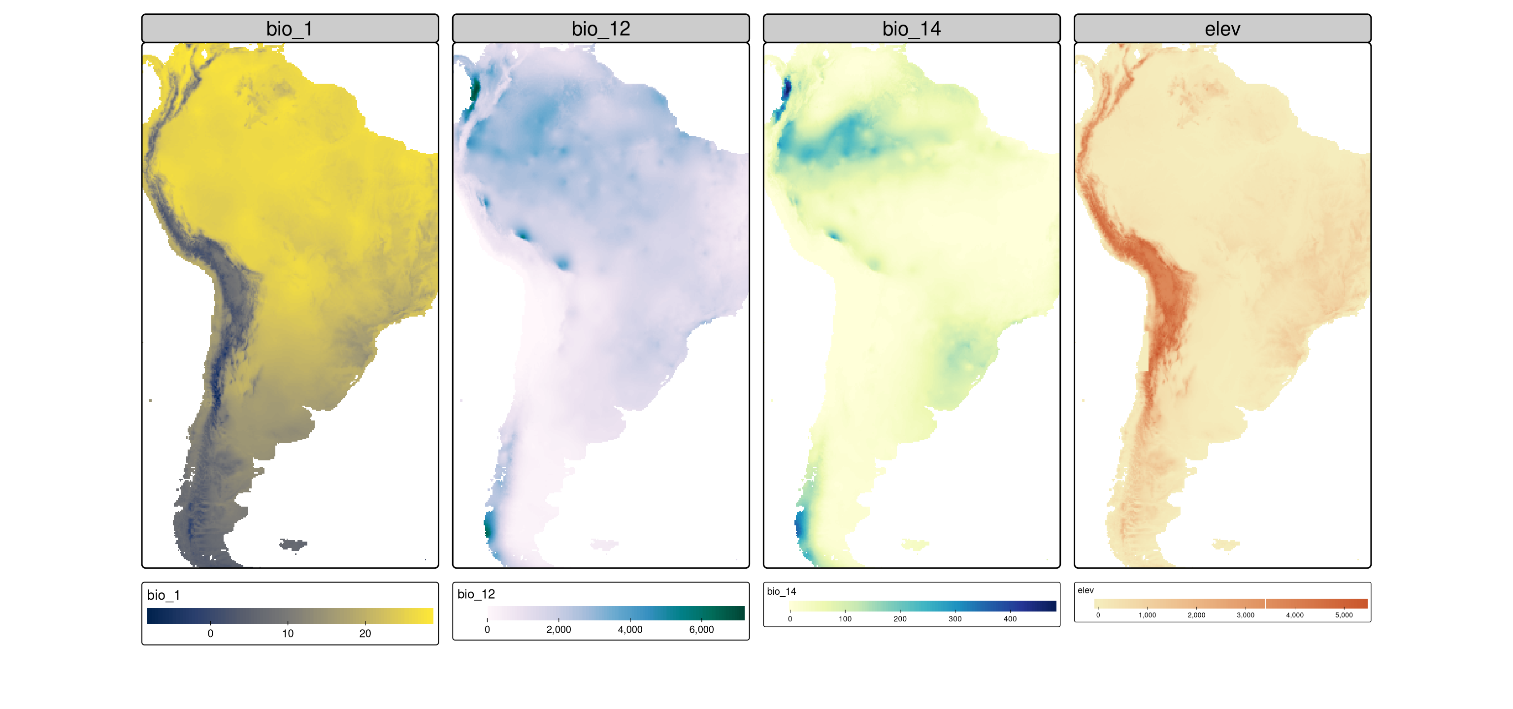 names(predictors) = c("bio_1", "bio_12", "bio_14", "elev")