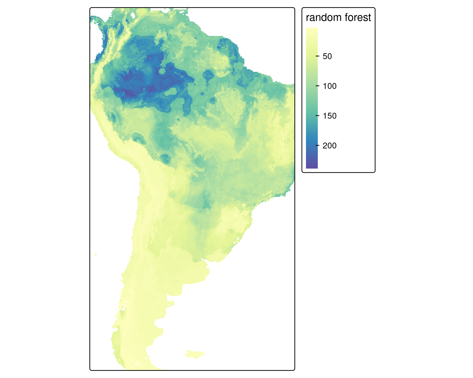 pred_rf2 = terra::predict(predictors, model_rf2, na.rm = TRUE)