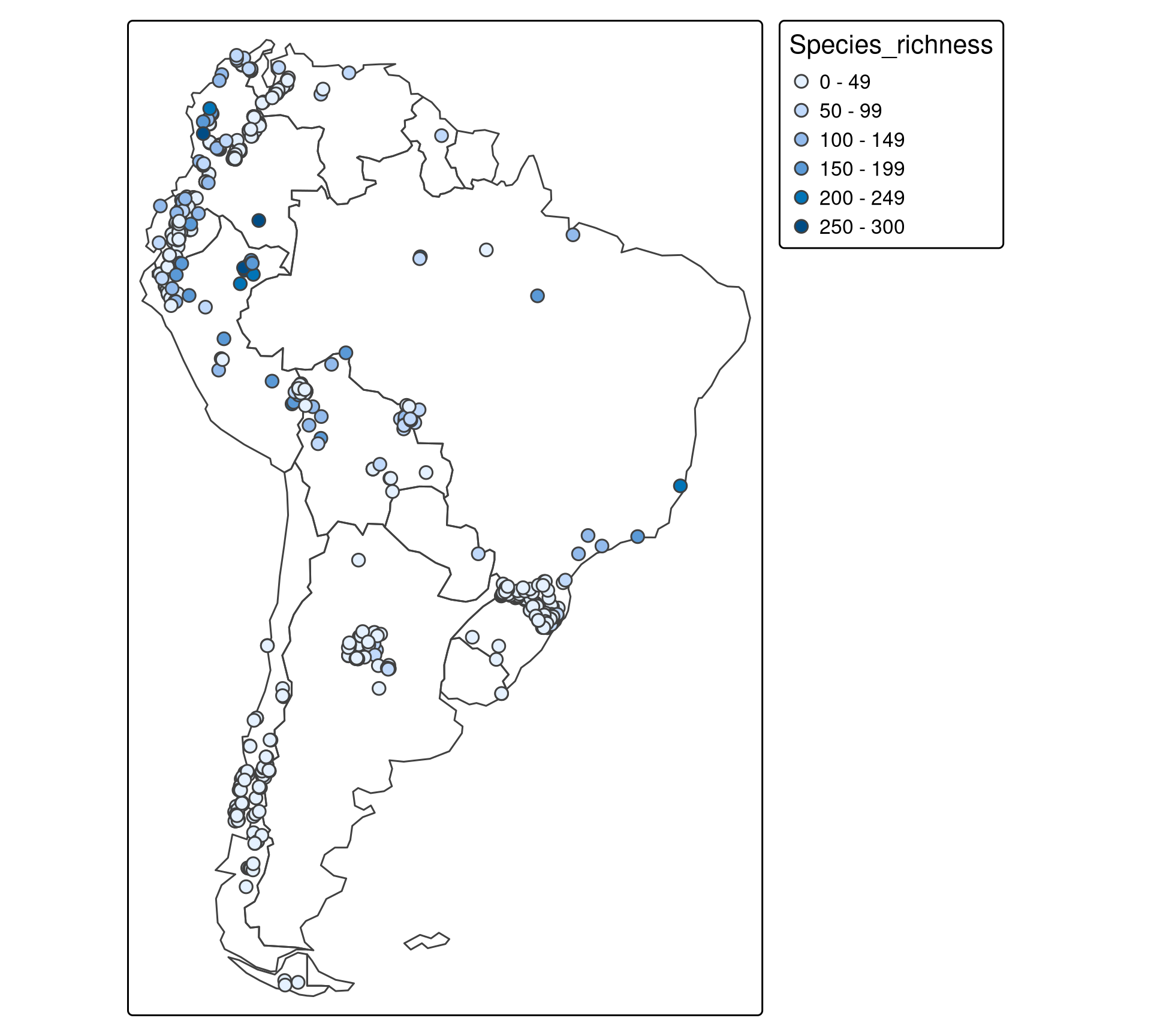 tm_symbols(fill = "Species_richness", size = 0.5)